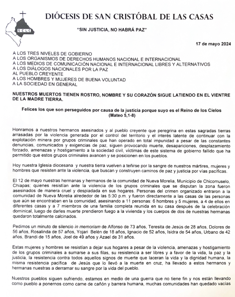 Diócesis de San Cristóbal de las Casas: Nuestros muertos tienen rostro, nombre y su corazón sigue latiendo en el vientre de la madre TierracontactocaminoalanMay 22, 20241 min readPublicado en Radio Zapatista24 de mayo de 2024Por Diócesis de San Cristóbal de las Casas
